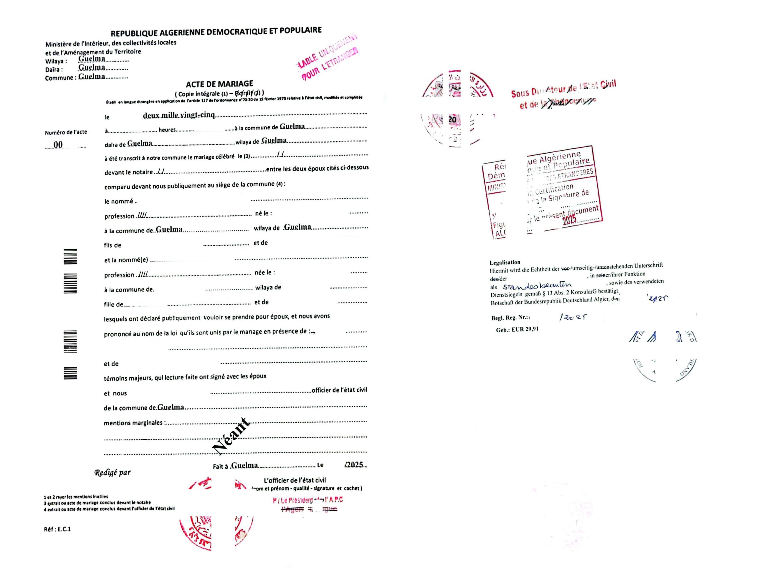 Muster einer Übersetzung eines Acte de Mariage (Heiratsurkunde) aus Algerien (Guelma) aus dem Französischen ins Deutsche. Auf der Rückseite befindet sich die Legalisation der Unterschrift des Standesbeamten und der Stempel der deutschen Botschaft in Algier.