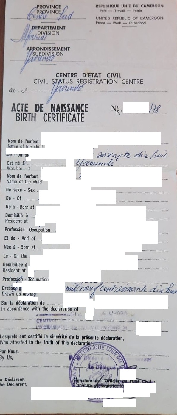 Muster einer Übersetzung einer Acte de Naissance (Geburtsurkunde) von 1978 aus Kamerun aus dem Französischen ins Deutsche.