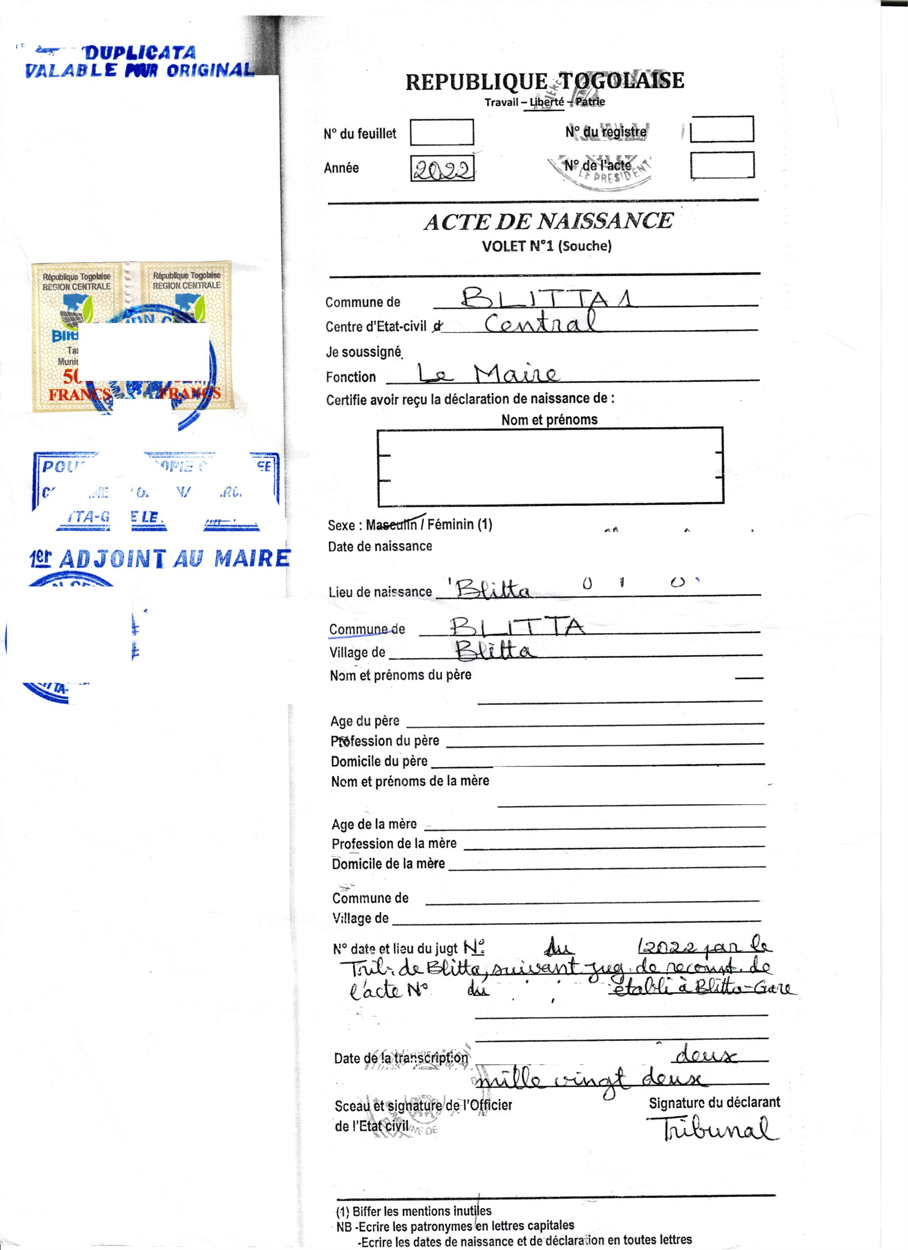 Muster einer Übersetzung einer Acte de Naissance (Geburtsurkunde) aus Togo aus dem Französischen ins Deutsche. Die Geburt wurde nachträglich registriert, was auf der Urkunde vermerkt ist.