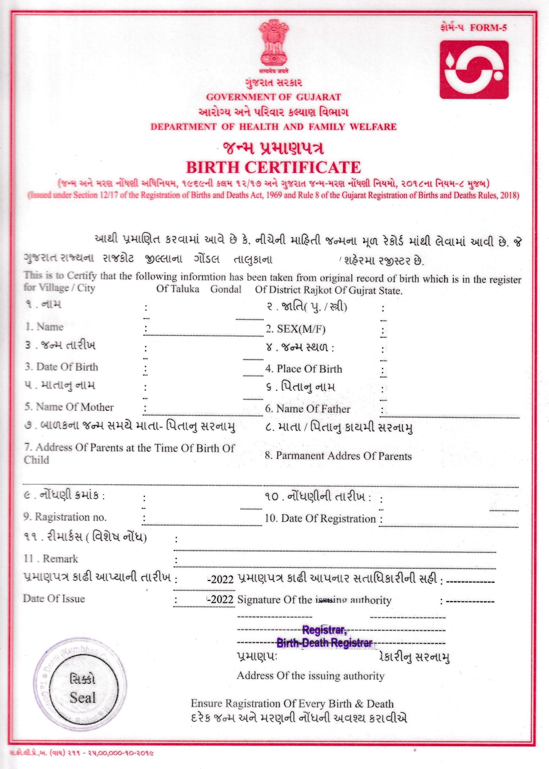 Muster einer Übersetzung eines Birth Certificate (Auszug aus dem Geburtenregister, Geburtsurkunde) aus Gujarat – Rajkot – Gondal, Indien, 2022, aus dem Englischen ins Deutsche.