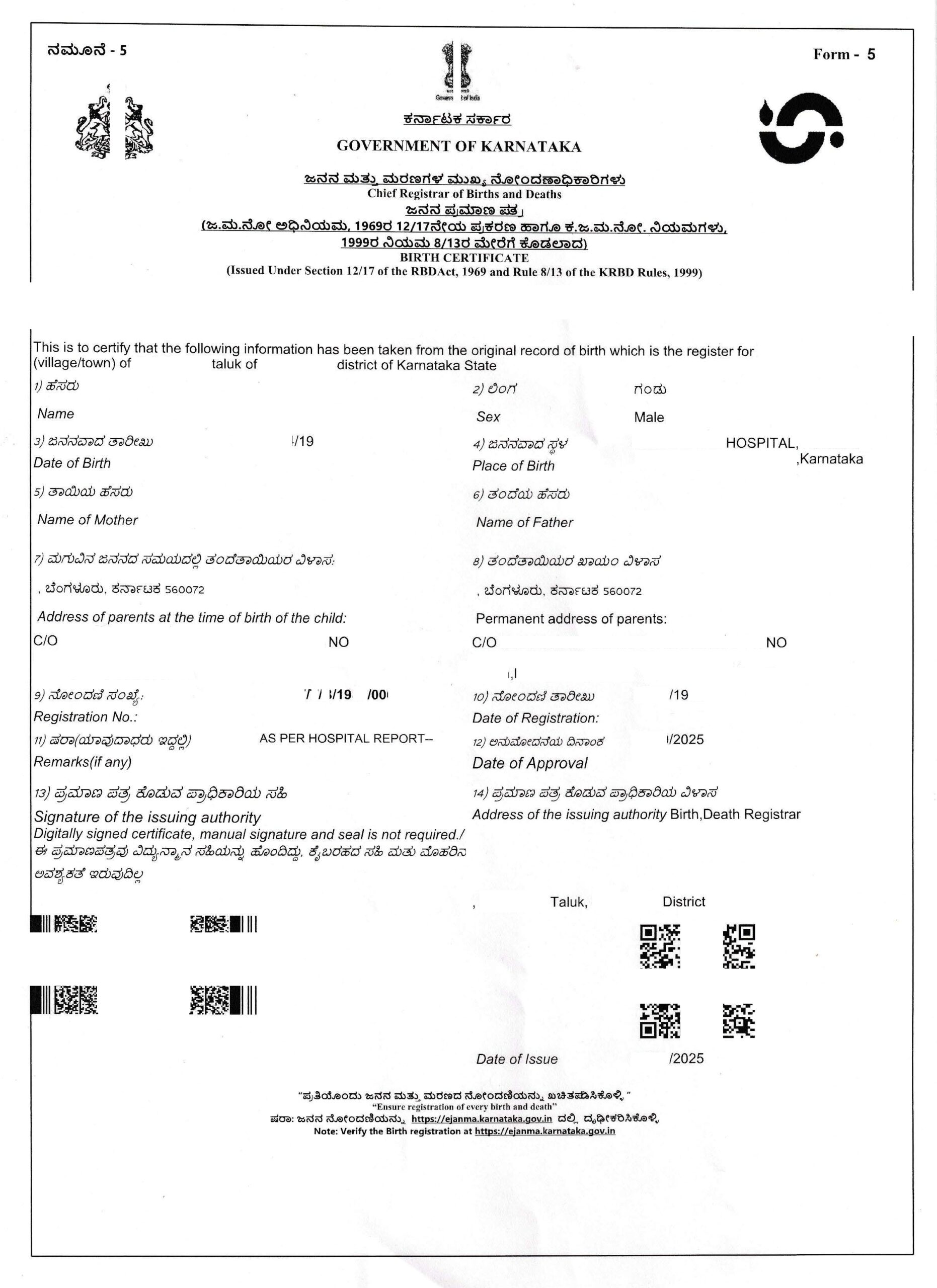 Muster einer Übersetzung eines Birth Certificate (Geburtsurkunde) aus Karnataka, Indien, 2025, aus dem Englischen ins Deutsche.