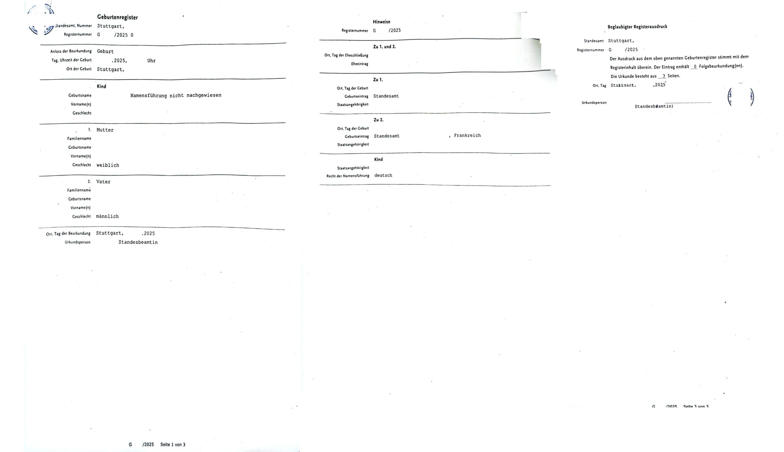 Muster einer Übersetzung eines beglaubigten Auszugs aus dem Geburtenregister aus Deutschland aus dem Deutschen ins Französische.