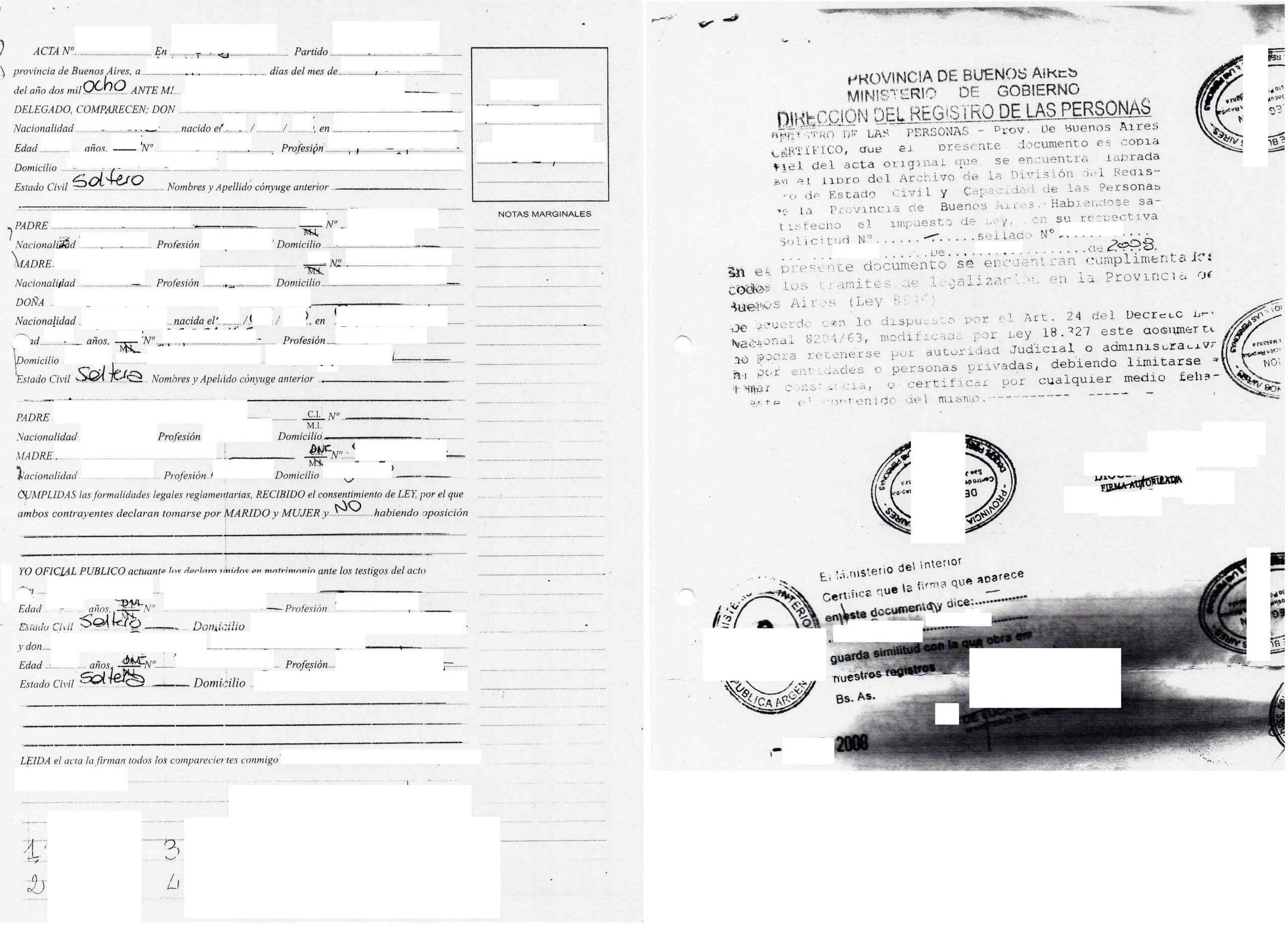 Muster einer Übersetzung einer argentinischen Heiratsurkunde von 2008 aus dem Spanischen ins Deutsche. Auf der Rückseite befindet sich die Bestätigungsformel über die beglaubigte Kopie aus dem Personenstandsregister in Buenos Aires.