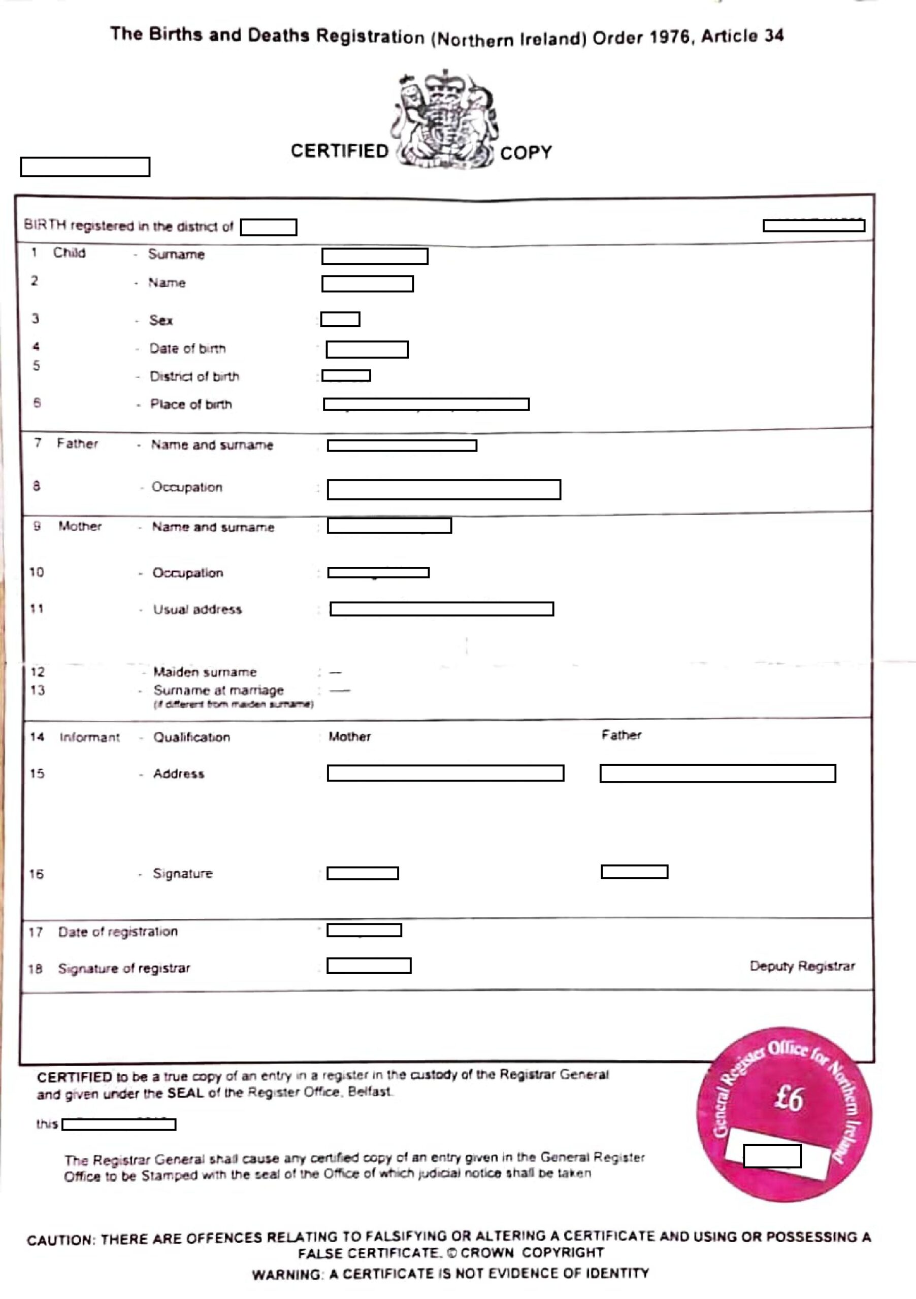 Muster einer Übersetzung einer Geburtsurkunde (Certified Copy) aus Irland aus dem Englischen ins Deutsche. Die ausgefüllte Urkunde hat rund 34 Zeilen.